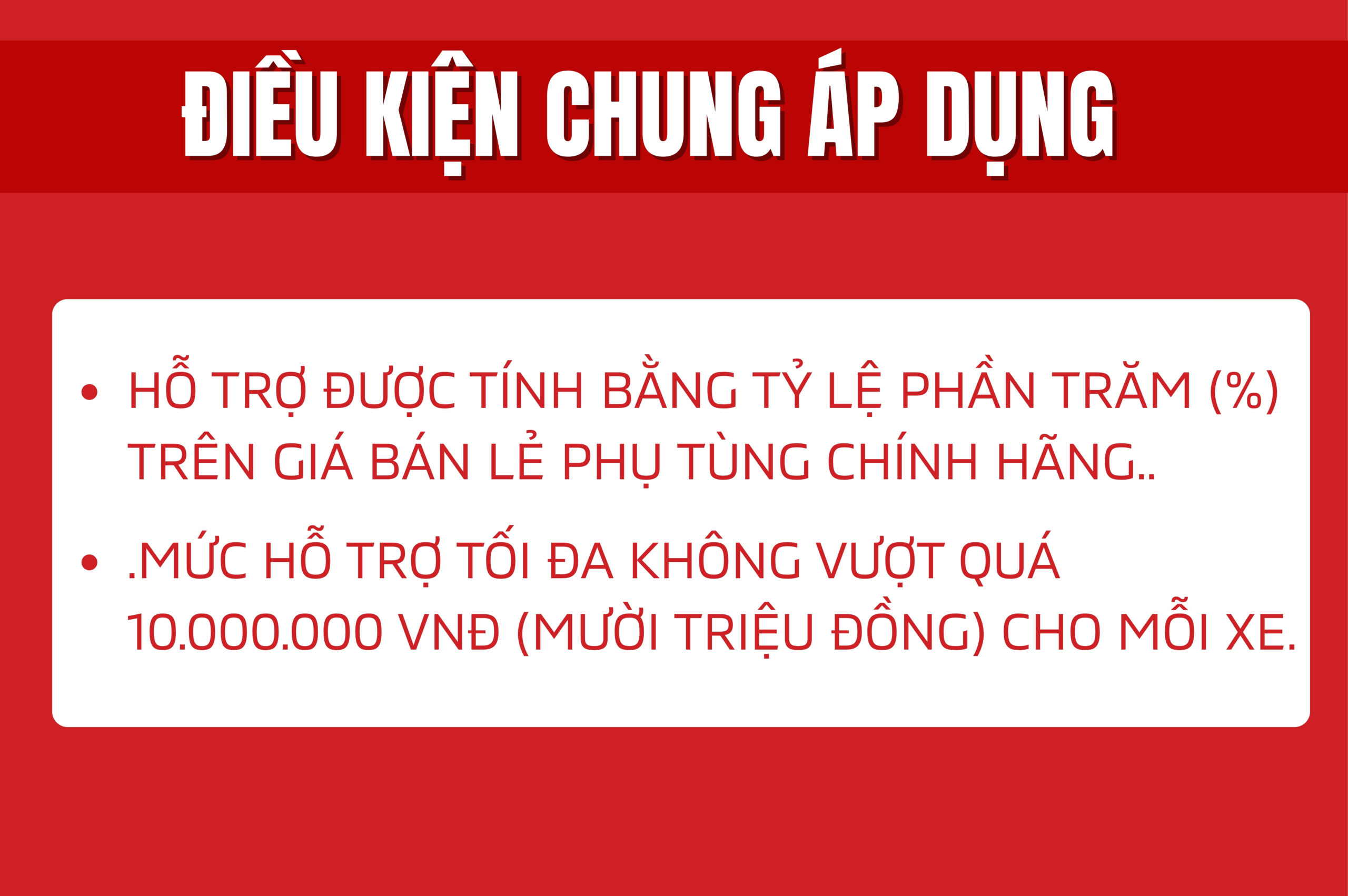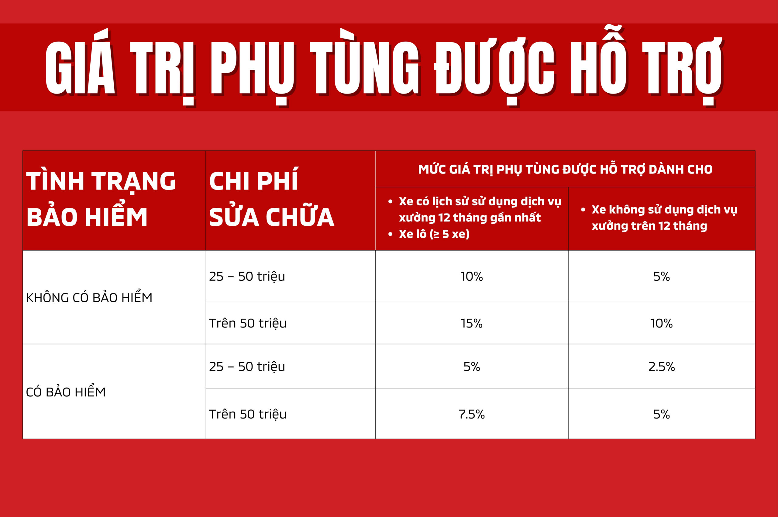 ✨ Giảm ngay từ 5% đến 15% giá trị phụ tùng chính hãng — tùy theo chi phí sửa chữa và tình trạng bảo hiểm.